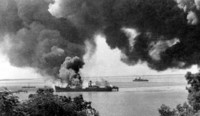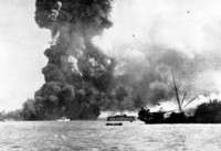 The moment of SS Neptuna's explosion, seen from sea; HMAS Deloraine left, HMAS Katoomba in the floating dock middle, a lifeboat mid-foreground, SS Zealandia burning and sinking on the right. (Copyright White Collection, Northern Territory Library.)