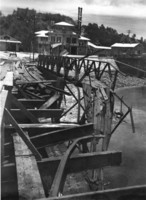 The twisted girders of the bombed jetty in front of the flying boat terminal. (Copyright R. Black Collection, Northern Territory Library.)