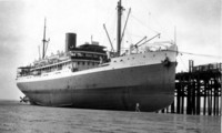 Coastal steamer Koolinda before the war resting on the mud beside Broome jetty, showing the enormous rise and fall of north-west tides. (Copyright C.A.Beurle Collection, Northern Territory Library.)