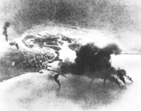 The bombing of Broome, 3 March 1942, from a Japanese observation plane. At left is smoke from the bombed airport; the pale smudge below is the Japanese cemetery. To the right of the cemetery is Broome township and the long jetty. In the middle is winding Dampier Creek, and to the far right are smoke plumes from burning flying-boats, casting a giant shadow over Roebuck Bay. (Copyright Jeremy Green.)
