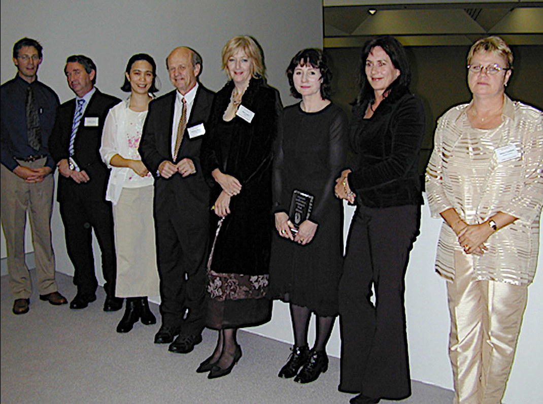 WA Premier's Book Awards, 20 May 2005. L-R: Anthony Eaton, Fireshadow, Young Adults. Greg Craven, Conversations with the Constitution, Non-Fiction. Miriam Wei Wei Lo, Against Certain Capture, Poetry. Anthony Barker, Behind the Play, WA History. Kate Lance, Redbill, Non-Fiction. Gail Jones, Sixty Lights, Fiction & Overall Winner. Jolly Read, Yandy, Script. Joanne Crawford, A Home for Bilby (Illust. Grace Fielding), Children.